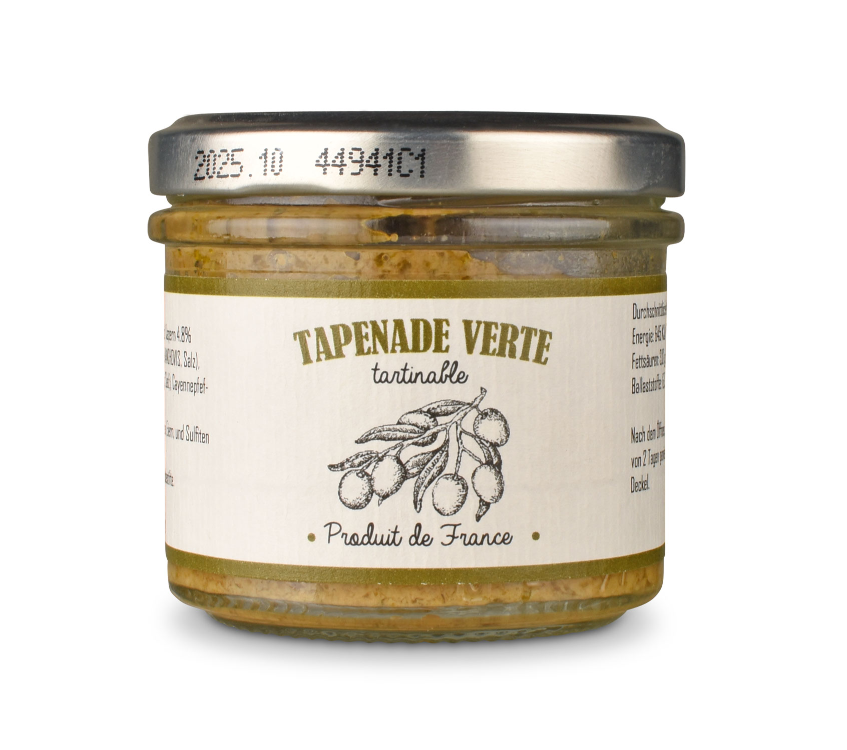 ZUTATEN: grüne Oliven 91% (grüne Oliven, Wasser, Salz), Kapern 4,8% (Kapern, Salz, Wasser, Essig), Olivenöl, ANCHOVISpaste (ANCHOVIS (FISCH), Salz), Kräuter, SENF (Wasser, SENFsamen, Essig, Salz), Cayennepfeffer