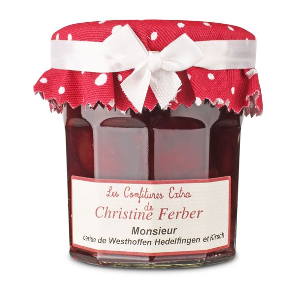 Zutaten: frische Elsässer Schwarzkirschen (83%). Zucker, Kirschwasser 1,6%, Apfelpektin, Zitronensaft