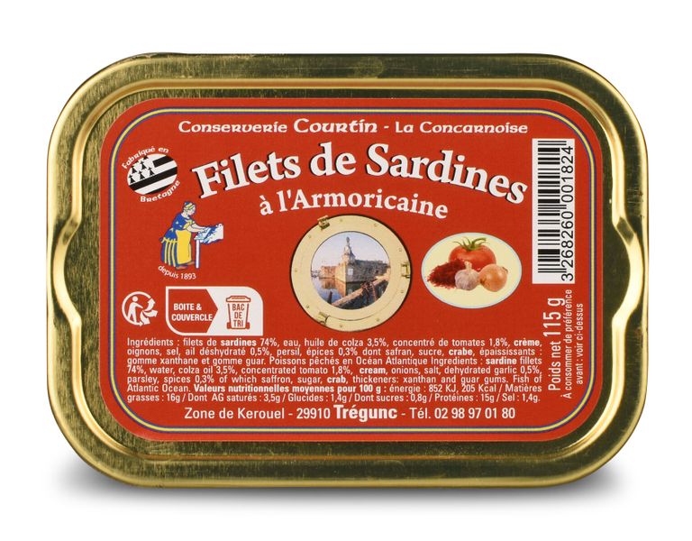 Zutaten: Sardinen 65,2% (FISCH), Andouille de Guémené 17,4% (Schweinedarm (Herkunft: EU), Salz, Pfeffer, Konservierungsmittel: Natriumnitrit, Aromen, Hülle: Rindermagen, Farbstoff: Karamell E150d), Sonnenblumenöl, Salz