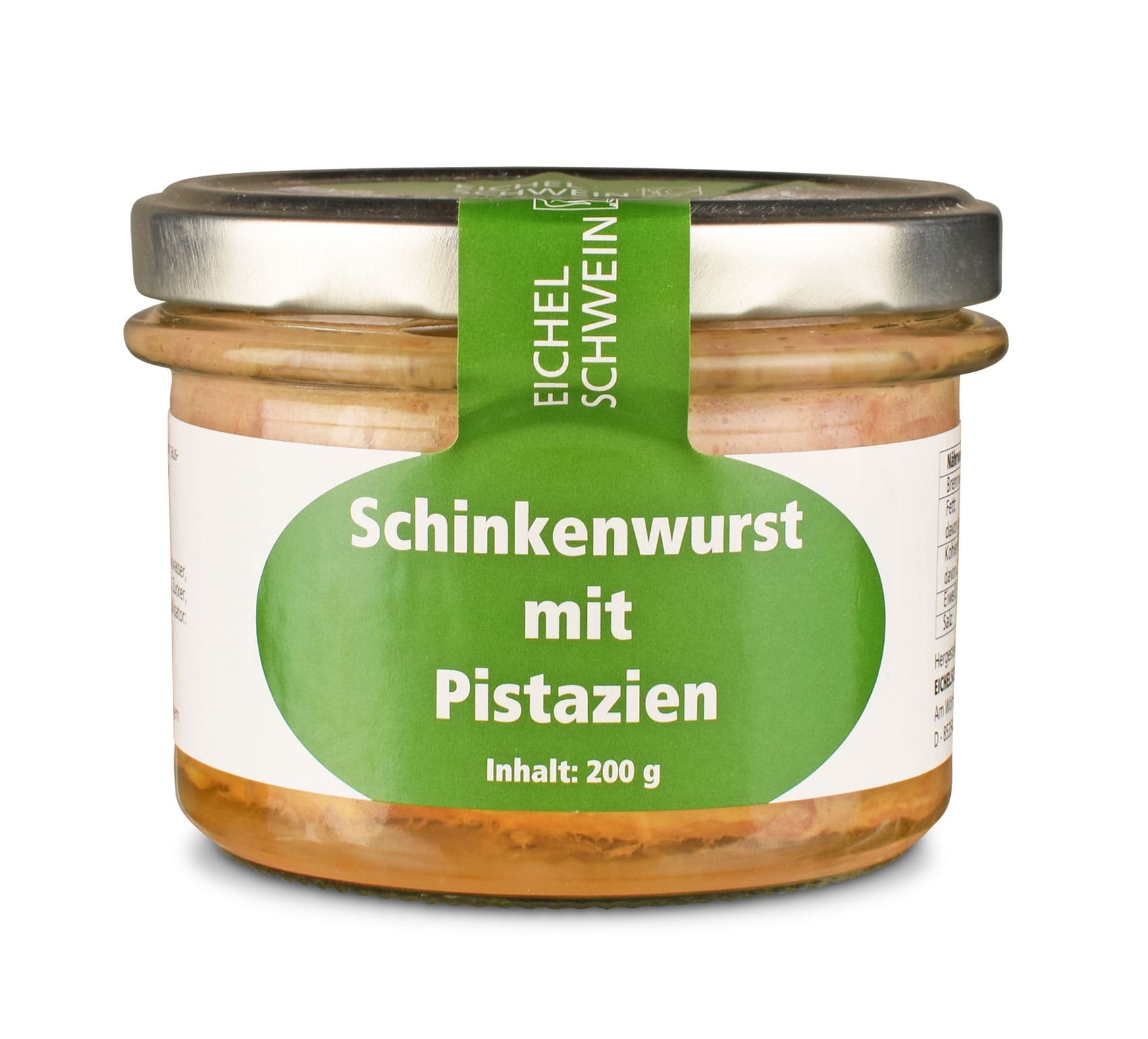 Zutaten: Schweinefleisch 70%, Speck, Trinkwasser, Steinsalz, PISTAZIEN (SCHALENFRUCHT) 3%, Gewürze, Zucker, SELLERIEwurzel, SENFsaat, Stabilisator: Trinatriumcitrat