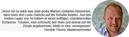 Der silbrige, zart roséfarbende Glanz in der Farbe kommt von den kleinbeerigen Pinot Noir-Trauben für die der Grand Cru-Ort Ay berühmt wurde. Ein sehr klassischer Champagner aus den besten Parzellen des Ortes und man fragt sich angsichts dieser hohen Qualität, warum man bisher soviel für andere Champagner bezahlt hat. Die Cuvée besteht aus 90 % Pinot Noir und 10 % Chardonnay, die 24 Monate auf der Hefe und ein weiteres auf der Flasche gereift wurde. Bei Gatinois wird im Stahltank vergoren, dadurch bleibt er im Charakter ein frischerer Typ.
