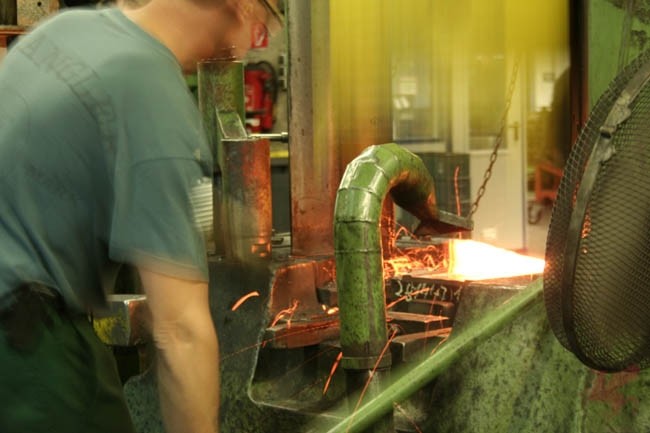 Die Klinge für ein Güde Messer wird ganz traditionell im Gesenk geschmiedet. "Schmieden im Gesenk sorgt für eine hohe Materialfestigkeit auch bei dynamischen Beanspruchungen der Klinge. Beim Gesenkschmieden wird der gesamte Schmiede-Rohling erwärmt und verformt.