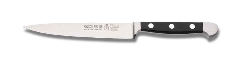 {"extensions":{"foreignKeys":{"extensions":[],"apiAlias":"product_manufacturer_foreign_keys_extension"}},"_uniqueIdentifier":"018b3e7dd97a734d955108d53c4c1ff6","versionId":"0fa91ce3e96a4bc2be4bd9ce752c3425","translated":{"name":"G\u00fcde Messer","description":"<h2>G\u00fcde Messer aus Solingen<\/h2><div>Das Unternehmen Franz G\u00fcde, mit Sitz in der Messerstadt Solingen, produziert in vierter Generation hervorragende Messer in traditioneller Handarbeit. Urspr\u00fcnglich waren diese sehr scharfen und ebenso robusten f\u00fcr Metzger, Schlachter und K\u00f6che gedacht. Doch schnell sprach sich herum, welch hohe Qualit\u00e4t G\u00fcde Messer besa\u00dfen und so erhielten sie Einzug in die Privatk\u00fcchen.<\/div><div>Heute wie damals ist der Weg zum Messer der Gleiche geblieben: Aus einem St\u00fcck Stahl werden Rohlinge im Gesenk geschmiedet, von Hand geschliffen, mit einem Griff versehen und von Hand abgezogen. Und noch heute gelten die alten Qualit\u00e4tsma\u00dfst\u00e4be, welchen kein Messer aus industrieller Fertigung stand halten k\u00f6nnte.\u00a0<span style=\"letter-spacing:0px;\">Seit einigen Jahren f\u00fchrt Franz G\u00fcdes Enkel, Dr. Karl Peter Born, das Unternehmen. Auch in der vierten Generation \u00e4ndert sich nichts am Unternehmensprinzip: G\u00fcde fertigt, in kleinen St\u00fcckzahlen geschmiedete, Messer von Hand.<\/span><\/div><br \/><strong>Das Material des Griffs: Holzgiffe oder Kunststoffgriffe<\/strong>\n<p>Holz ist ein nat\u00fcrliches Material. Seine Farbe und Maserung machen aus einem Messer einen echten Hingucker. Aber auch beim Greifen eines Messers zeigt Holz seine angenehme Seite, f\u00fchlt es sich doch warm und handschmeichelnd an. Griffe aus Holz sind jedoch nicht sp\u00fclmaschinengeeignet, im Gegenteil zu Griffen aus Kunststoff. Kunststoffgriffe von G\u00dcDE sind aus Hostaform und erf\u00fcllen die Anforderungen der Gastronomie. Sie sind pflegeleicht und sp\u00fclmaschinenfest.<\/p>\n<p><strong>Das Schmieden: Gesenkschmieden oder Stauchschmieden\u00a0<\/strong><\/p>\n<p>Die Klinge f\u00fcr ein G\u00fcde Messer wird ganz traditionell im Gesenk geschmiedet. \"Schmieden im Gesenk sorgt f\u00fcr eine hohe Materialfestigkeit auch bei dynamischen Beanspruchungen der Klinge. Beim Gesenkschmieden wird der gesamte Schmiede-Rohling erw\u00e4rmt und verformt. <br \/>Im Gegensatz dazu wird beim Stauchschmieden nur ein kleiner, meist der mittlere Teil des Bandstahls erw\u00e4rmt und dann verformt. Diese Methode wird meist aus fertigungs\u00f6konomischen Gr\u00fcnden angewendet, das erzielbare Formengut ist sehr begrenzt.<br \/>Beim Gesenkschmieden ist die Formensprache frei von der Klingenspitze bis zum Griffende. Deshalb bleibt G\u00dcDE dieser bew\u00e4hrten Technologie treu.\"<\/p>\n<p><strong>Der Erl: Voll-Erl oder Steckerl\u00a0<br \/><\/strong><\/p>\n<p>Als Erl bezeichnet man den Teil des Stahls, an dem der Griff eines Messers befestigt ist. Geht der Erl von der Klinge bis zum Ende des Griffes, so spricht man vom Voll-Erl. Der Steck-Erl steckt, wie der Name sagt, im Griff, so dass man ihn nicht sieht.<br \/>Den Voll-Erl hingegen sieht man bei den Messern der Serie Alpha zwischen den Griffschalen, bei Serien wie SYNCHROS oder Caminada ist der Voll-Erl als Quer-Erl am unterne Ende des Griffes ausgebildet.<br \/>Die Messer von G\u00dcDE haben durchweg einen Voll-Erl, da sich dadurch eine bessere Ausbalancierung des Gewichts ergibt. Eine Ausnahme bildet THE KNIFE. Da dieses Messer nur im sogenannten \u00dcbergriff verwendet wird, ergibt sich die Ausbalancierung automatisch durch die Griffhaltung, so dass der Schwerpunkt im Innern der Hand liegt.<\/p>\n<h3>Vom Stahl zum Messer<\/h3>\n<p>Heute wie damals ist der Weg zum Messer der Gleiche geblieben: Aus einem St\u00fcck Stahl werden Rohlinge ganz traditionell im Gesenk geschmiedet, von Hand geschliffen, mit einem Griff versehen und von Hand abgezogen. Alle, wirklich alle Arbeitsschritte, finden im eigenen Haus in Solingen statt. Und noch heute gelten die alten Qualit\u00e4tsma\u00dfst\u00e4be, welchen kein Messer aus industrieller Fertigung stand halten k\u00f6nnte. Ohne Kompromisse. Neben den klassischen Kochmesser Serien hat sich G\u00fcde Messer einen Namen mit seinen einzigartigen Designs gemacht. Und so gelten einige Messer aus dem Hause bereits als Design-Klassiker, wie beispielsweise das einzigartige 'The Knife'.<\/p>\n<h3>Die G\u00fcde Messer Serien<\/h3>\n<p>Die einzelnen G\u00fcde Serien unterscheiden sich in den verarbeiteten Griffmaterialien. F\u00fcr die Serie Alpha werden Griffschalen aus robustem Hostaform verwendet. Edle H\u00f6lzer finden in den Griffen der G\u00fcde Serie Alpha Fasseiche, Serie Alpha Birne, Serie Alpha Olive Verwendung.<\/p>\n<p>An das Klingenmaterial von Messern sind eine F\u00fclle von Anforderungen zu stellen, die sich zum Teil widersprechen. Also gilt es, ein Optimum zwischen den verschiedenen Anforderungen zu realisieren. So soll ein Messerstahl hart sein, jedoch nicht zu hart, da er ansonsten brechen w\u00fcrde. Er soll aber auch nicht zu weich sein, da das Messer sonst durch Abnutzung zu schnell stumpf werden w\u00fcrde. Daher sind die Messer der G\u00fcde Serie Alpha aus einem Chrom-Molybd\u00e4n-Vanadium-Stahl gefertigt, der eine optimale H\u00e4rte von ca. 57-58 HRc (Rockwell) hat.<\/p>\n<p>Gro\u00dfartige Messer f\u00fcr Profi- und Hobbyk\u00f6che. Made in Solingen. Gestern wie heute. Der heutige Firmeninhaber und Enkel des Firmengr\u00fcnders Franz G\u00fcde, Dr. Karl Peter Born sagt: \"Genau so sahen Messer vor 100 Jahren aus, so wurden sie gemacht.so f\u00fchlen sie sich an.\".<\/p>","customFields":{"plentymarketsManufacturerId":"70032","cbaxProductCount":{"018ad22de21c73c89317df2e5a15c171":119},"cbaxManufacturerMetaTitle":"G\u00fcde Messer - Kochmesser mit Tradition aus Solingen","cbaxManufacturerMetaDescription":"Profi-K\u00fcchenmesser aus Solingen \u2713 Original G\u00fcde-Messer \u2713 Feinste Handarbeit \u2713 Das G\u00fcde-Sortiment hier beim Fachh\u00e