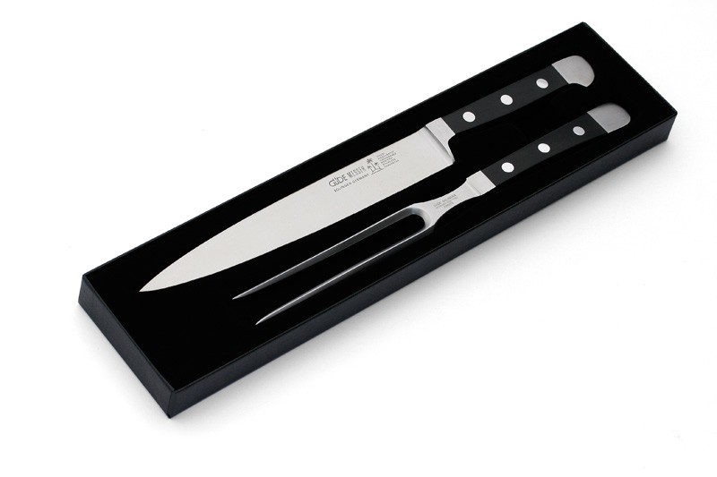 Das Güde Tranchierbesteck-Set besteht aus einem Tranchiermesser mit 21 cm Klingenlänge und der passenden Fleischgabel. Verpackt im eleganten Geschenkkarton.