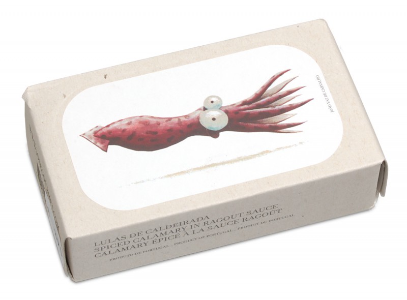 Zutaten: Kalmar (70,8%) (WEICHTIERE), Tomate (19,8%), Sonnenblumenöl (4,2%), Gewürze (Zwiebeln, Petersilie, Roter Pfeffer, Wein (SULFITE))(4,2%), Salz