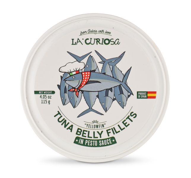 Zutaten: ThunFISCH (Thunnus ssp.) 70%, Pesto 30% (Olivenöl 72,4%, Basilikum 11,6%, Parmesankäse (MILCH) 7,2%, Salz 7,2%, Knoblauch <1%, weißer Pfeffer <1%)