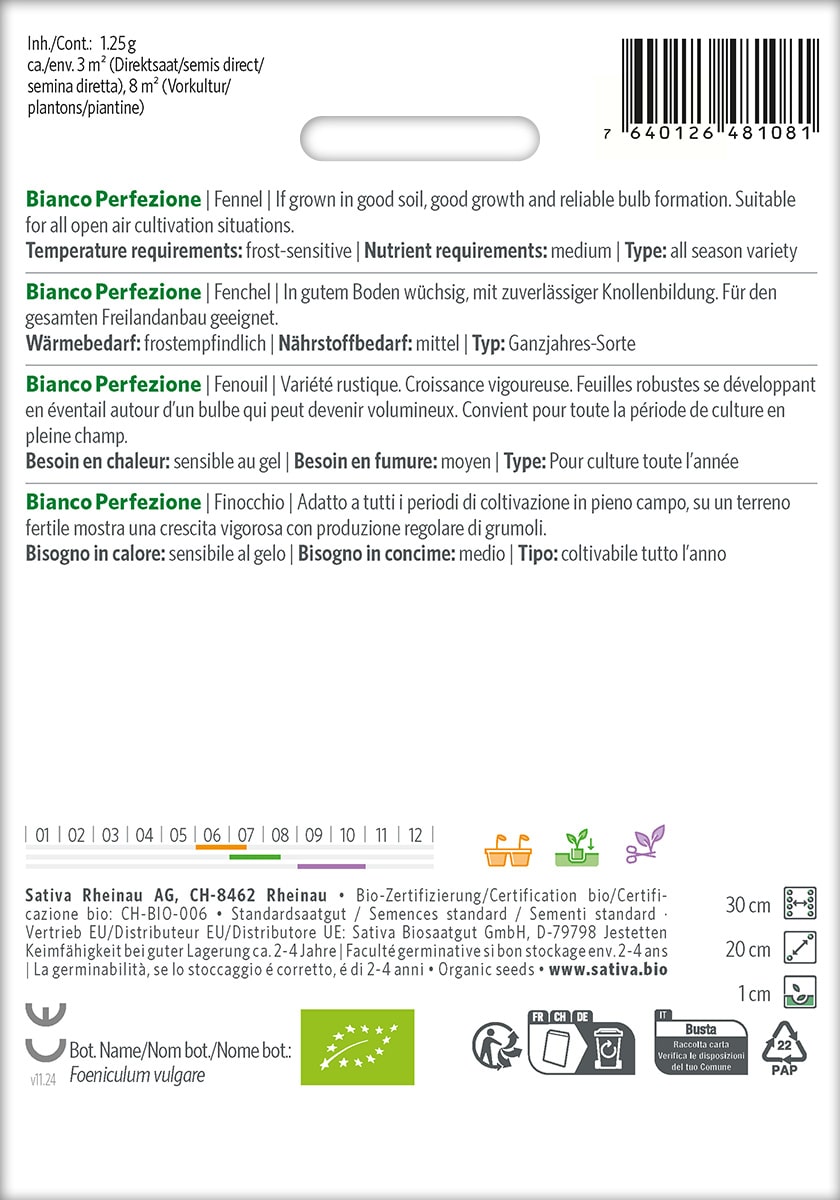 Fenchel reagiert deutlich auf Tageslichtlänge, Temperatur und Wasserversorgung. Umso wichtiger ist es eine Sorte zu wählen, die mit den hiesigen - klimabedingt veränderten - Bedingungen gut zurecht kommt. Da lohnt es sich auch über den Tellerrand zu blicken. Hier kommt eine zuverlässige Knollenfenchelsorte aus Italien, welche in gutem Gartenboden auch im Freiland sehr gut gedeiht und als Ganzjahressorte gilt.