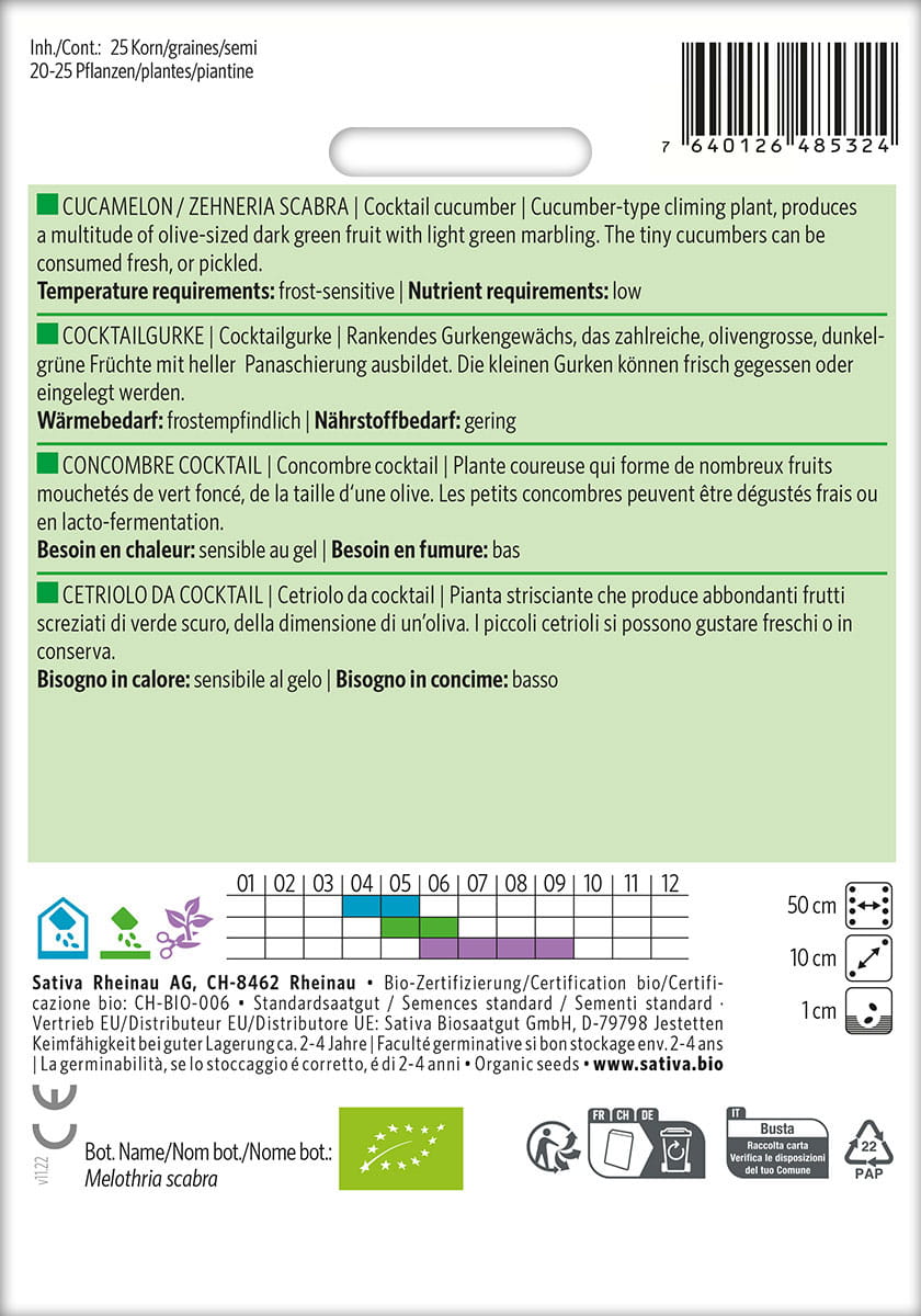 Ein Highlight aus der großen Familie der Gurkengewächse ist die kleine Melothria. Die rankenden, einfach anzubauenden Pflanzen tragen zahlreiche, olivengrosse, dunkelgrüne Früchte mit heller Panaschierung. Die kleinen Gurken können frisch gegessen oder eingelegt werden