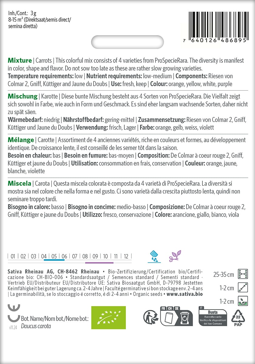 Diese bunte Mischung besteht aus 4 Möhren-Sorten von ProSpecieRara. Die Vielfalt zeigt sich sowohl in Farbe, wie auch in Form und Geschmack. Es sind eher langsam wachsende Sorten, daher nicht zu spät säen.