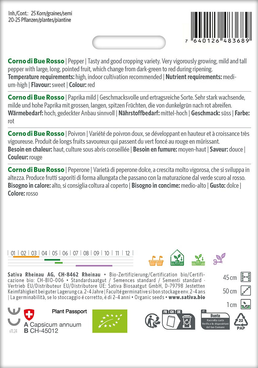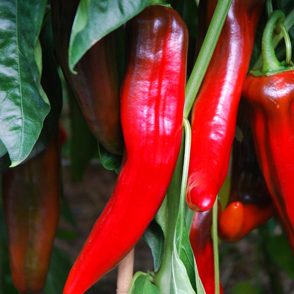 Geschmacksvolle und ertragsreiche Sorte. Sehr stark wachsende, milde, süße und hohe Peperoni mit grossen, langen, spitzen Früchten, die von dunkelgrün nach rot abreifen.