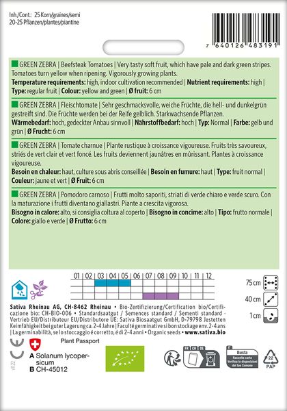 Die Tomatensorte Green Zebra wurde von ProSpecieRara als seltene bzw. alte Sorte ausgezeichnet. ProSpecieRara ist eine Stiftung, die sich für den Erhalt der Vielfalt von seltenen Pflanzensorten einsetzt. In langjähriger Kooperation mit ProSpecieRara ist unser Saatgutproduzent Sativa aktiv in der wichtigen Erhaltung und Pflege dieser traditionellen Sorten.