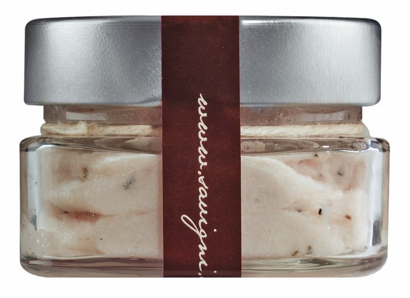 Diese Crema ist aus dem weißen Speck der Rasse Cinta Senese gemacht. Der wird mit Rosmarin, schwarzem Pfeffer und etwas Zimt gewürzt. Die Creme schmeckt sehr gut auf geröstetem Brot. Man kann auch Wintergemüse damit verfeinern.