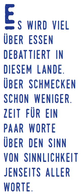 Genuss ist, ebenso wie die Liebe, zutiefst selbstgenügsam. Wer genießt, zieht gerade keine Gräben und baut keine Barrikaden; der Diskurs über das Richtige im Falschen ruht. Dieser suspekte Moment der Seeligkeit ist es, um den es geht. Manchmal fällt er vom Himmel, einfach so, wie die Liebe. Häufig jedoch bedarf es einer gewissen persönlich-politischen Empfänglichkeit, die ihn befördert. Dinses Culinarium. Ein Manifest für die Sinne:
