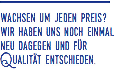Mehr denn je! Und jetzt komme ich auf Ihre Anfangsfrage zurück: Wofür stehen wir? Wohin soll die Reise gehen? Wir haben uns diese Frage vor gut fünf Jahren tatsächlich noch einmal sehr intensiv gestellt. Wachsen um jeden Preis? – Wir haben uns noch einmal dagegen entschieden und setzen stattdessen auf Qualität.