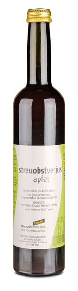 Aus einer kleinen Streuobst-Mosterei kommt dieser Apfel-Verjus. Verjus (= Grünsaft oder Agrest) ist der Saft von grün geerntetem Obst. Er ist nicht zum (Pur-)Trinken gedacht, sondern wird in der kreativen Küche als Alternative zu Essig oder Zitronensaft eingesetzt.Für diesen Apfel-Verjus werden besonders säurereiche, spätreifende Apfelsorten verwendet, welche allerdings besonders früh geerntet werden. Auf diese Weise hat der Saft nur einen geringen Fruchtzucker- und hohen Säureanteil.Im Vergleich zu Essig und Zitronensaft ist Apfel-Verjus weniger stark sauer. Außerdem bringt er natürlich den typischen Geschmack grüner Äpfel mit - damit bekommen Salat-Dressings, Soßen und Suppen eine ganz besonderes Aroma, ohne dass dieses so dominant hervortritt wie Essig. Im Essen merkt man Verjus eher als eine allgemein fruchtige Note.
