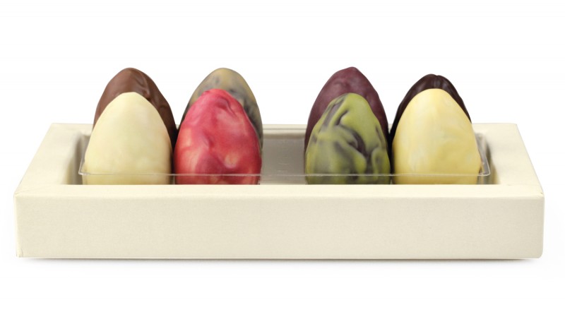 1 Dunkles Schokoladen-Ei° gefüllt mit Haselnusscreme°(55%), getunkt in Preiselbeerkuvertüre°(7%) VEGAN- lila Folie1 Milchschokoladen-Ei° gefüllt mit Karamellcreme°(55%), getunkt in Karamellkuvertüre°(7%) - goldene Folie