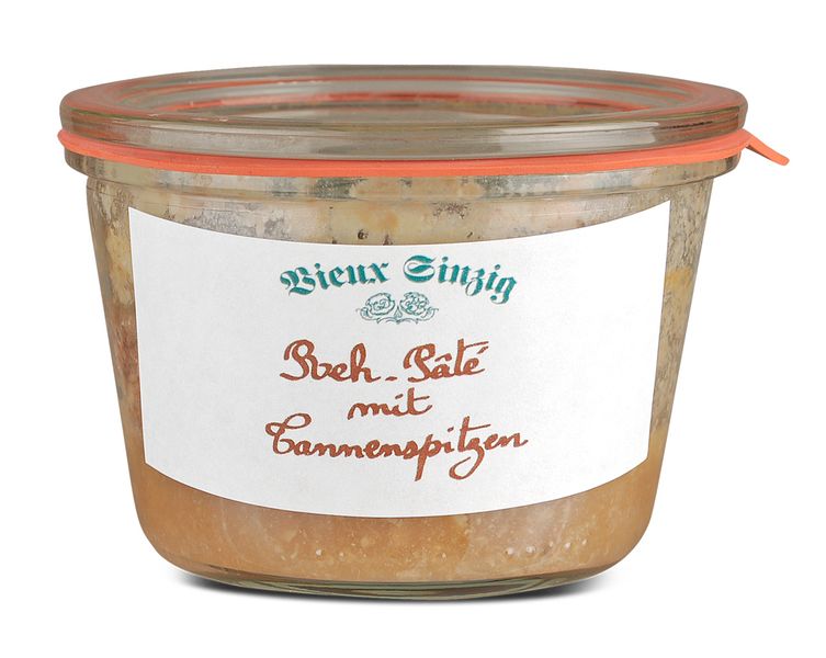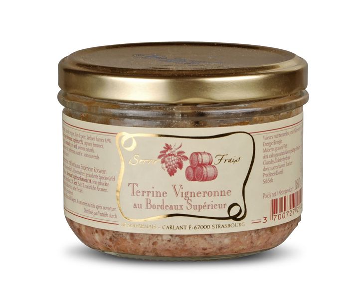 Zutaten: Schweinebauch, Geflügelfett, Pineau-Likörwein (SULFITE), Zwiebeln, Salz, Zucker, Rosmarin, Koriander, Lorbeer, Bohnenkraut, Fenchel, Anis, Nelke, Zimt, schwarzer Pfeffer.