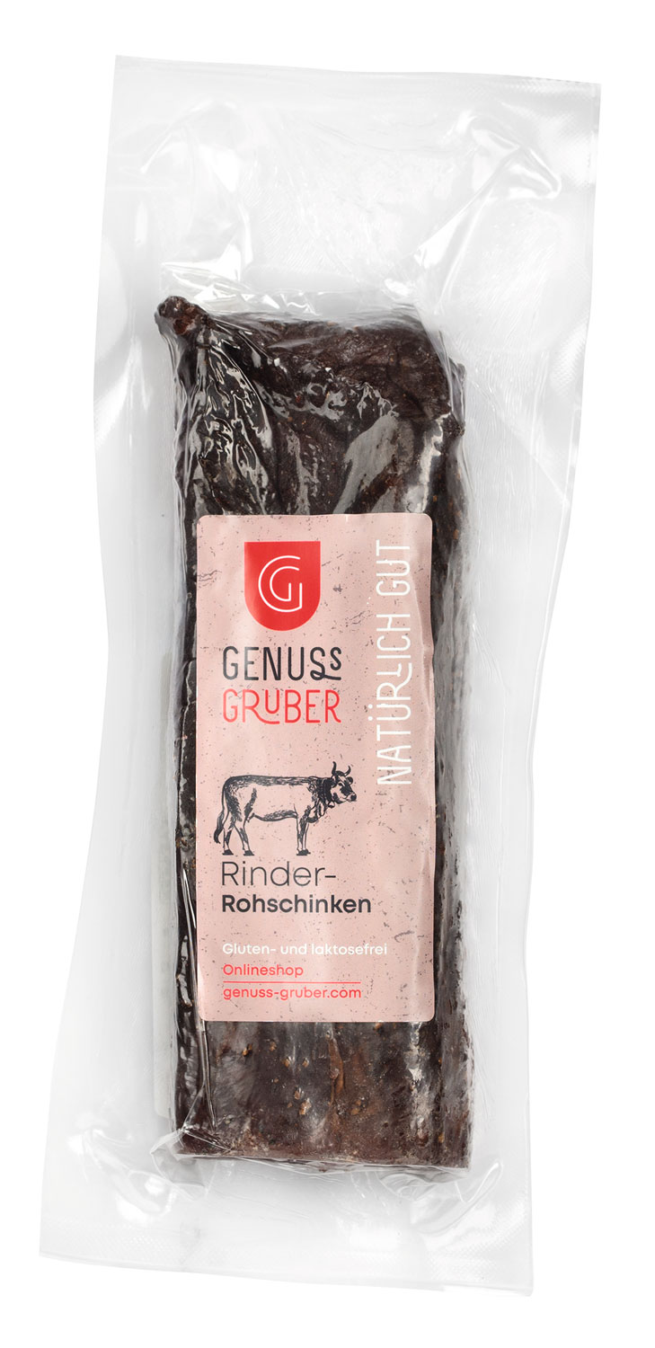 Verkehrsbezeichnung: luftgetrockneter Rinderrohschinken, geräuchert