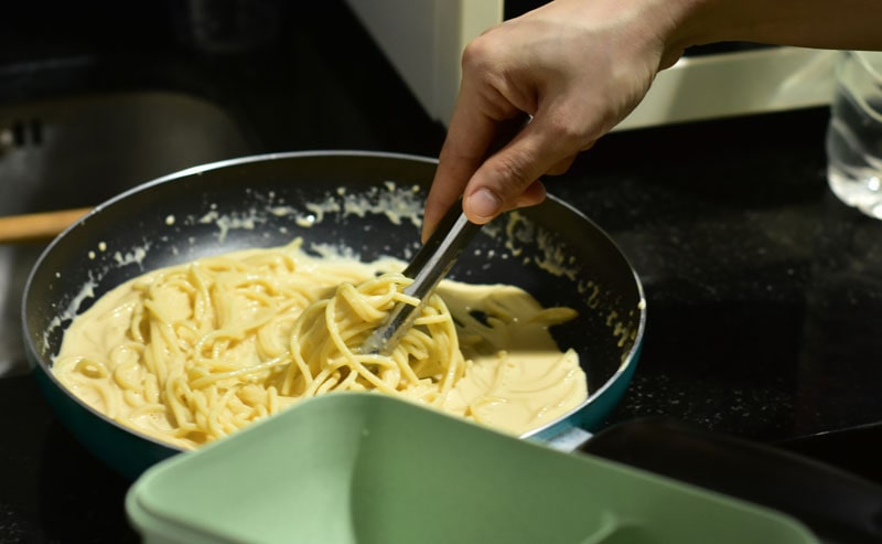 - Etwas Nudelwasser und gutes italienisches Olivenöl dazugeben