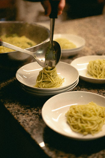3. Spaghetti abgießen (etwas Kochwasser aufheben), direkt in die Pfanne geben und durchschwenken.