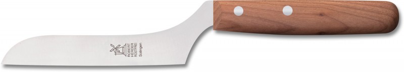Von Hand dünn und scharf geschliffen, bewältigt es mühelos sowohl weichen Camembert als auch harte Salami. Seine gewinkelte Form verhindert ein Anstoßen der Finger beim Schneiden auf der Schneidunterlage. Das perfekte Käsemesser von Windmühle.