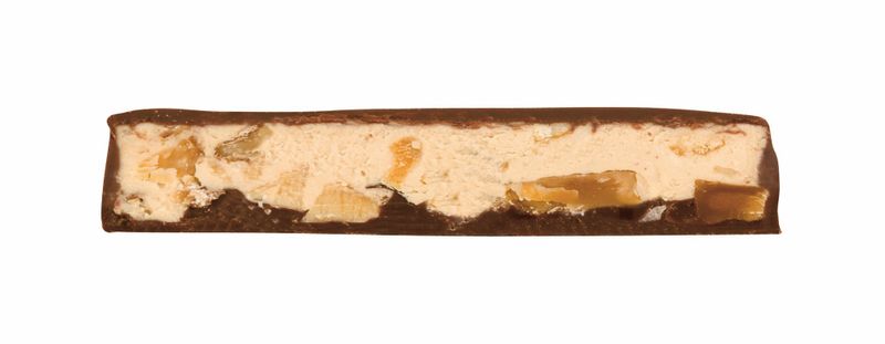 Dunkle Milchschokolade° gefüllt mit Mandelnougat°(48%) und karamellisierten Mandeln°(12%)