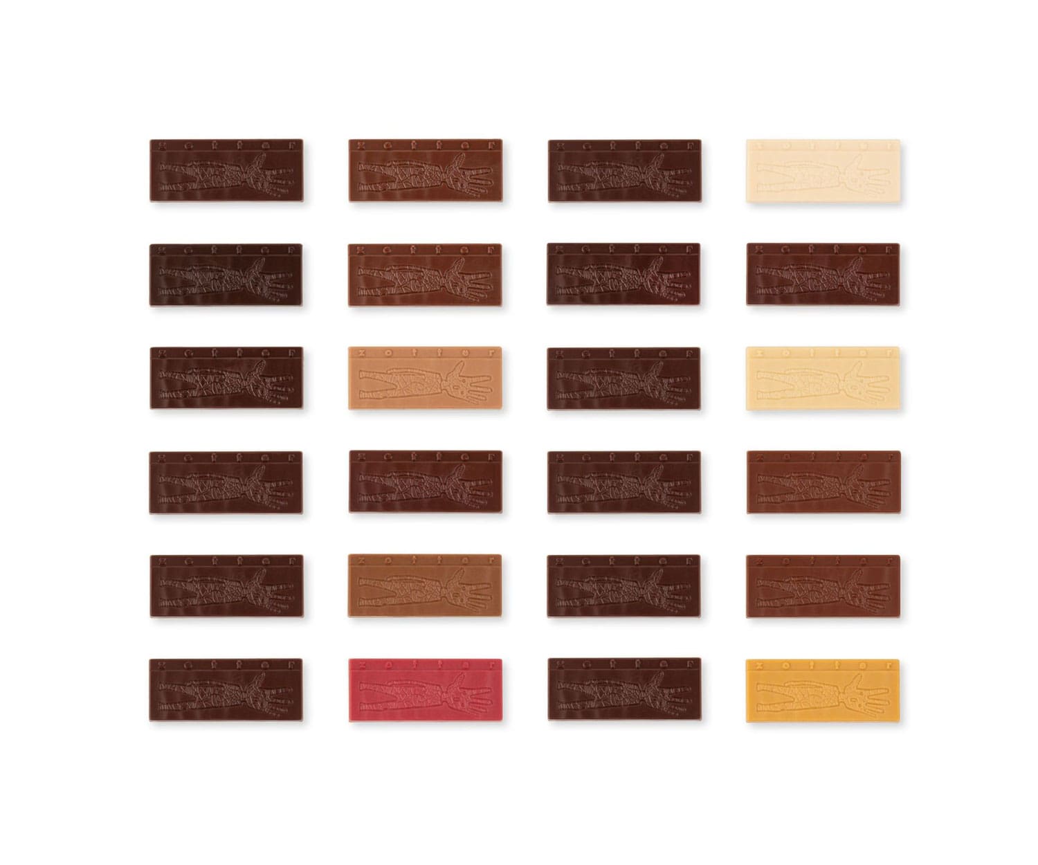 Kollektion von 24 Ursprungsschokoladen° und Schokoladen-Tafeln° mit Kakaobutter°