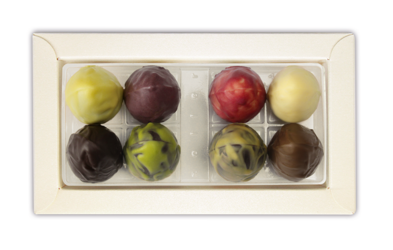 1 Dunkles Schokoladen-Ei° gefüllt mit Haselnusscreme°(55%), getunkt in Preiselbeerkuvertüre°(7%) VEGAN- lila Folie1 Milchschokoladen-Ei° gefüllt mit Karamellcreme°(55%), getunkt in Karamellkuvertüre°(7%) - goldene Folie