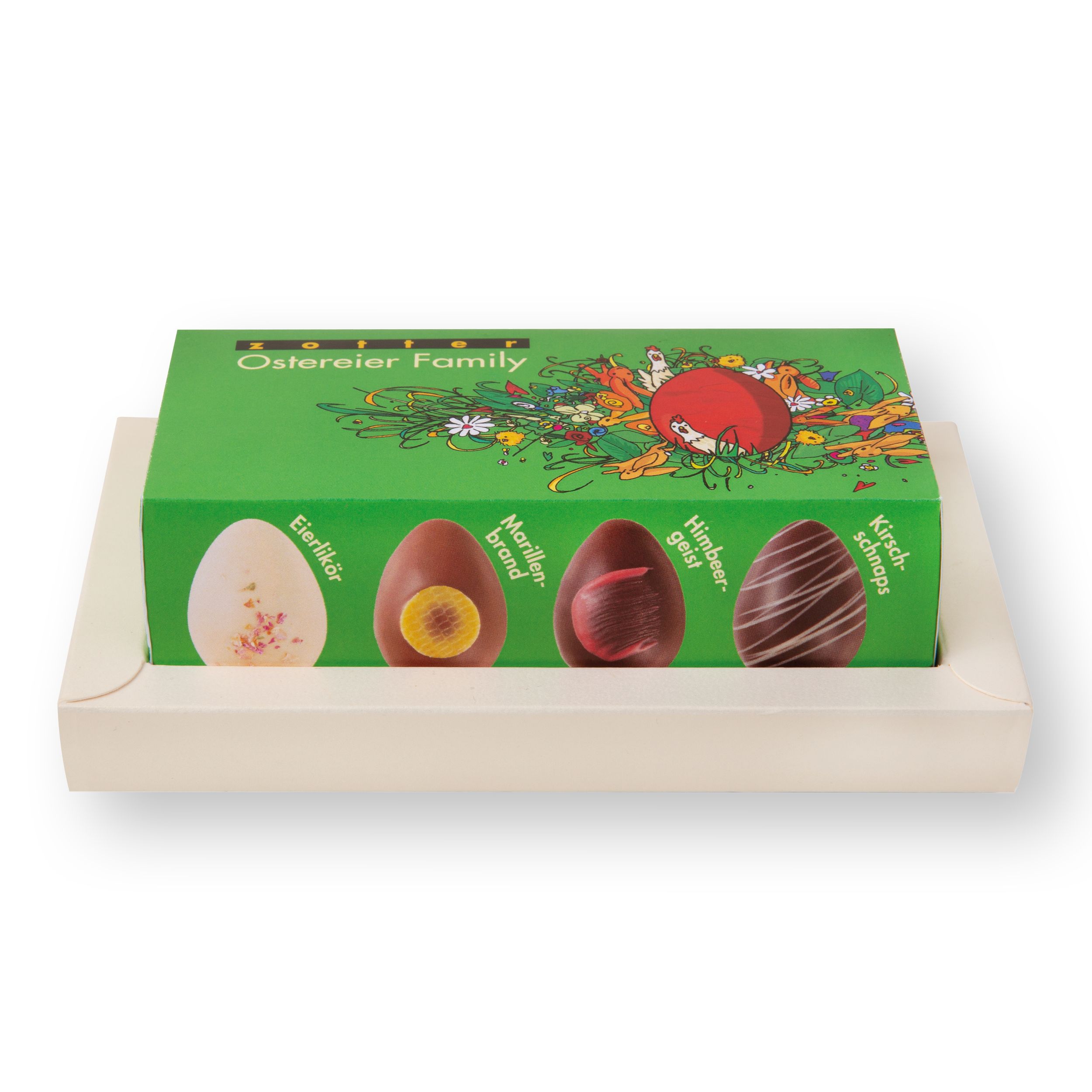 Das Zotter Ostergeschenkset mit vier alkoholischen und vier alkoholfreien Schokoeiern, die alle unterschiedlich gefüllt sind und mit Eierlikör, Himbeergeist und feinen Nougatcremen locken – da ist für jeden in der Familie eine Nascherei dabei.