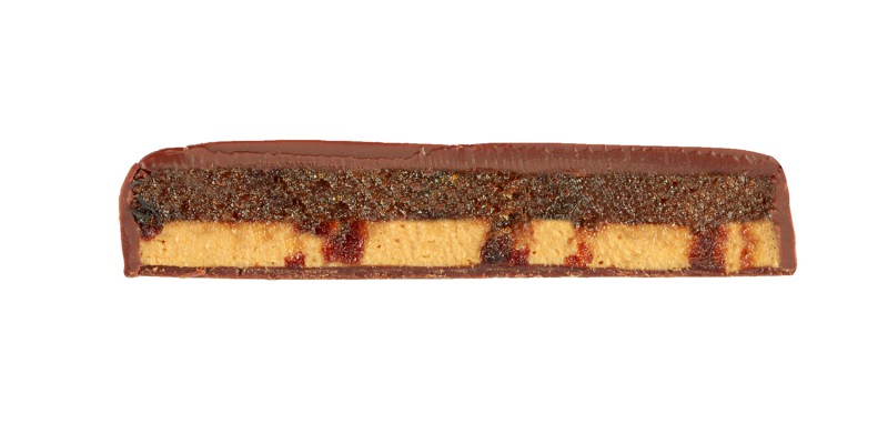 Extradunkle Milchschokolade° gefüllt mit Karamellnougat°(25%) und Marzipan°(23%) mit Rumpflaumen°(11%) - alkoholhaltig