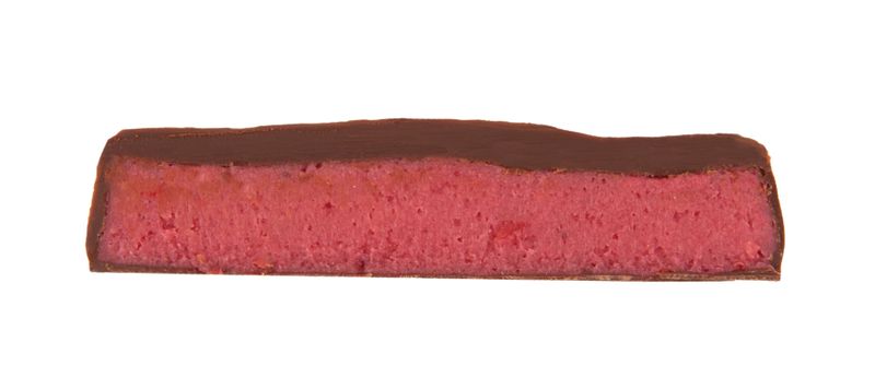 Hafer-Schokolade° gefüllt mit einer roten Früchte-Ganache°(28%) und Mandelnougat° mit Fruchtstücken°(28%)