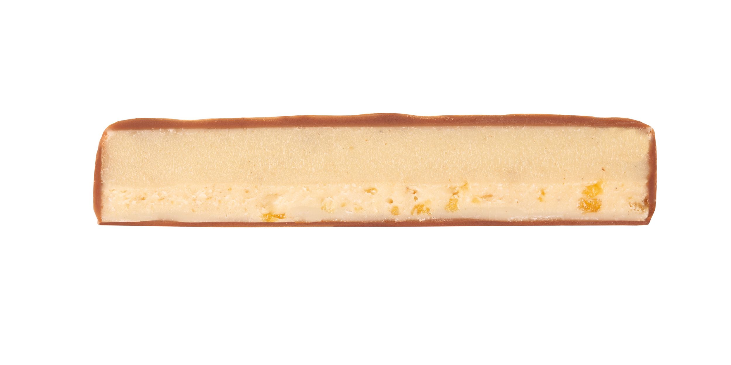 Milchschokolade° gefüllt mit Mandelnougat°(20%) mit Crisps°(2%) und Vanilleganache°(40%)